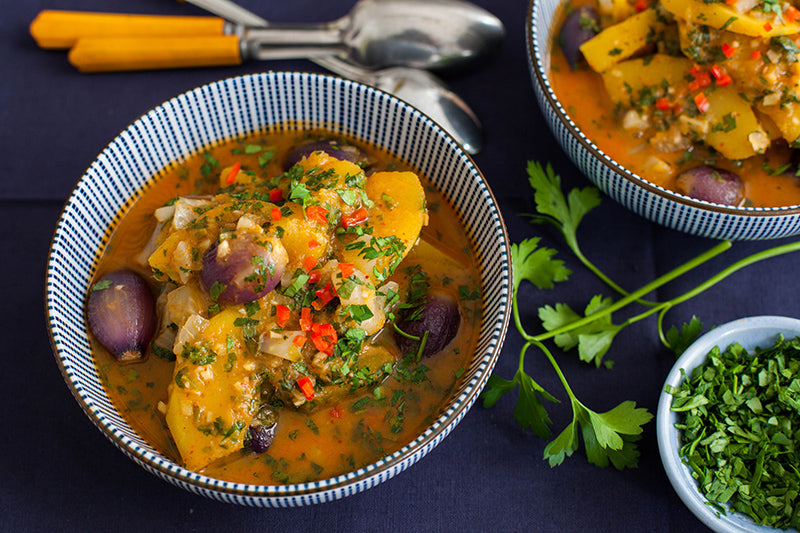In medium soup pot, heat 1 tablespoon olive oil over medium heat. Add onions and season with sea salt and pepper. Cook 3 minutes then add curry powder, garlic, and ginger. Cook 30 seconds more; then add coconut milk and stock. When squash and potatoes are fork tender, remove from oven. Add potatoes directly to pot. Let squash cool a few minutes. Skin of squash will come off easily. Cut squash into 1-inch pieces; then add to pot. Let stew simmer another 10 minutes. Taste and adjust seasoning. Top with parsley and and serve.