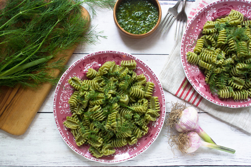 Once water is boiling cook nettle pasta for 7 minutes, them drain and toss with pesto. Divide between two plates and top with cheese of your choice.