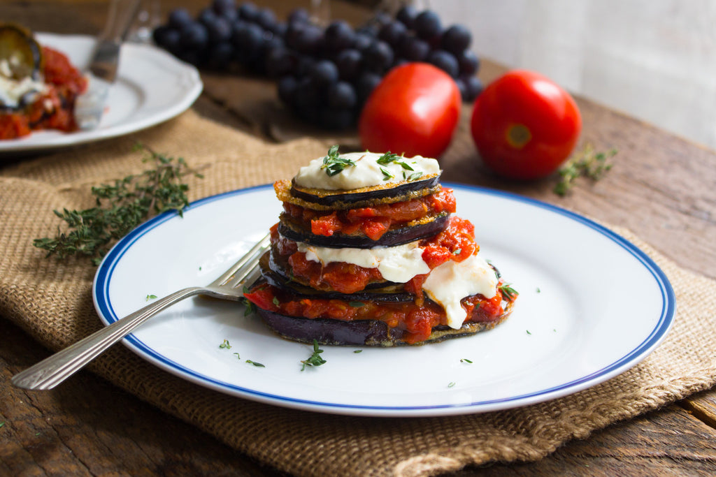 Place the eggplant into a large casserole dish and top with the tomato sauce. Dot with chunks of burrata and season with a pinch of salt and pepper. Place into the oven and cook until the cheese is melted and bubbly, about 20 minutes. Divide among 4 plates and garnish with remaining oregano.