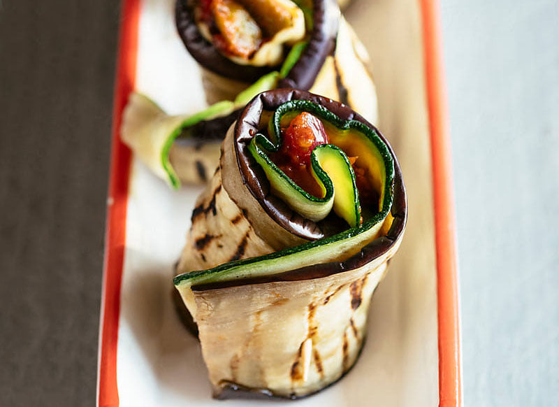 Take a strip of eggplant, layer on a strip of zucchini; then gently spread a layer of tomato mixture over it. Roll strip up and spear with a cocktail stick/toothpick, if necessary, to seal it closed.