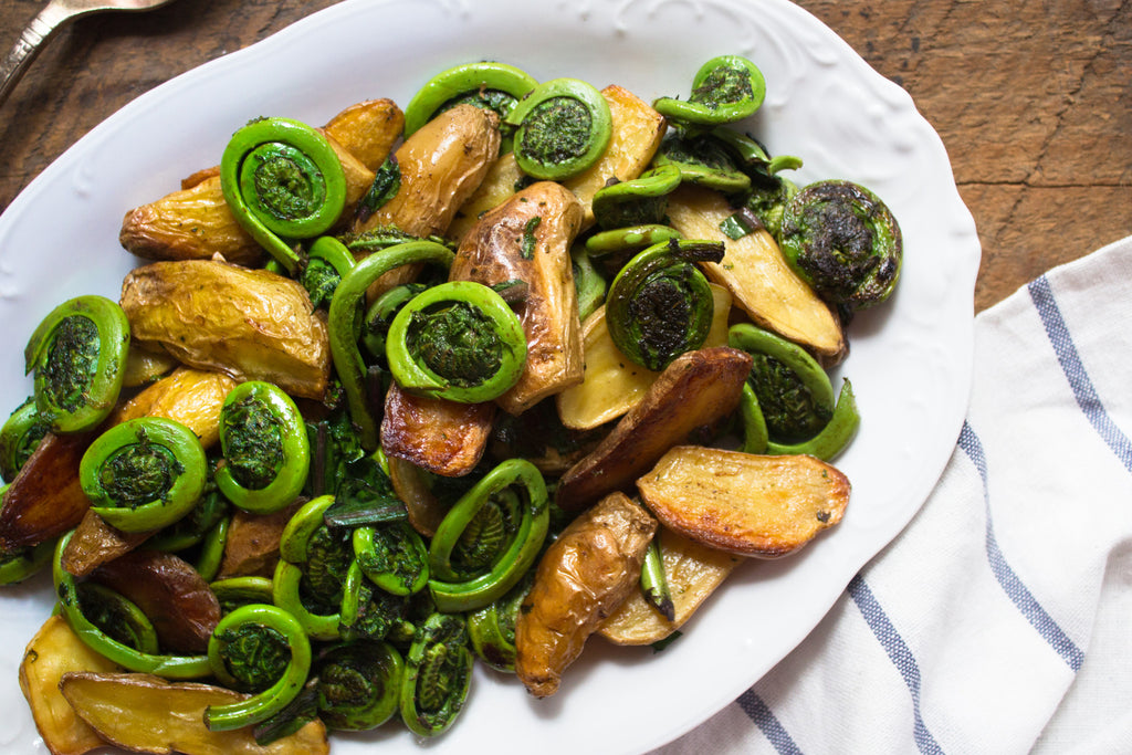 In a medium pot of salted water, bring potatoes to a boil and cook until knife tender, about 8 minutes. Add fiddleheads and cook until bright green, about 1 minute. Drain and set aside.