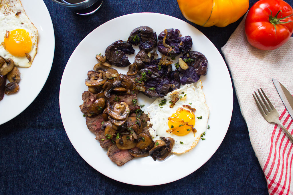 Slice the steak across the grain and divide evenly among two plates. Garnish with the mushrooms. Finish each plate with the potatoes and fried eggs.