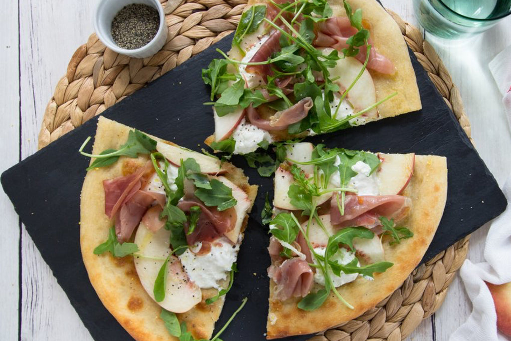 Preheat the oven to 450 degrees. Coat a baking sheet or pizza pan with a thin layer of olive oil or a dusting of cornmeal. On a clean working surface dusted with flour, gently stretch the pizza dough to fit your pan, roughly a 12" circle or 10" x 6" rectangle will do. Gently place dough in the pan, prick all over with a fork and lightly brush with olive oil. Place in the oven and bake until it begins to turn golden, about 10 minutes. Remove from oven, layer on the prosciutto, and dollops of ricotta. Place back in the oven and bake for another 5 minutes, until prosciutto crisps. Remove from oven, top with arugula and torn basil leaves. Drizzle with olive oil and balsamic vinegar and finish with a sprinkle of flaky salt and freshly ground pepper.