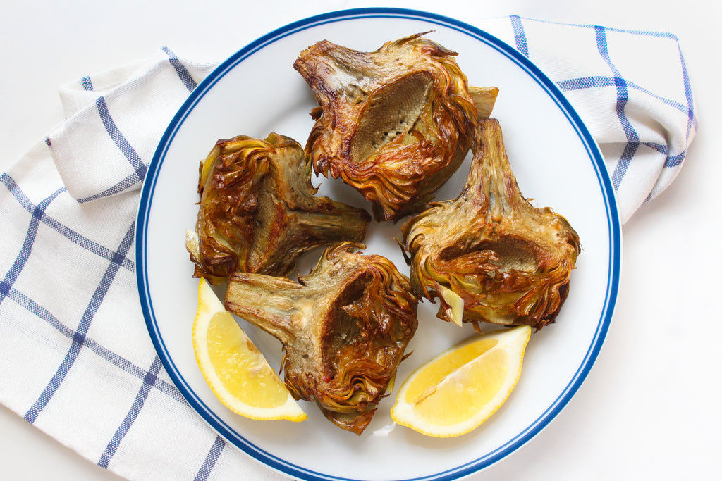 To prepare artichokes for frying, remove first few layers of leaves until pale yellow ones with green tips are revealed. Using a paring knife, trim base of any hard outer layer. Peel stem until you reach pale colored center. Cut artichoke in half lengthwise, and trim thorny top. Remove fuzzy centers with spoon or melon baller. Immediately, place into large bowl filled with cold water and squeezed lemons until ready to fry.