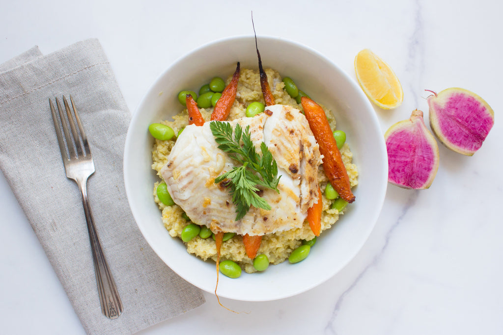 Place a layer of millet in a bowl, then a layer of shelled edamame and roasted carrots. Place fillets of fish on top, then pour the brown butter and ginger sauce over the whole thing.