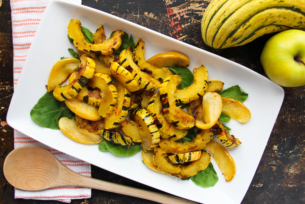 Preheat oven to 325 degrees. Rub cut sides of squash with 1 tablespoon olive oil and season with sea salt and pepper. Rub ginger over cut sides of squash and into flesh. Lay squash on baking sheet, cut side down, and roast 15 minutes, until it starts to soften. Turn squash, cut side up, and roast 17 minutes longer, until tender; then transfer to a work surface and let cool slightly. Increase oven temperature to 425 degrees. Cut squash into 1 1/2-inch-thick wedges. Oil baking sheet with 1 tablespoon olive oil and arrange squash and pear slices on it; roast 25 minutes, turning halfway through, until golden and serve.