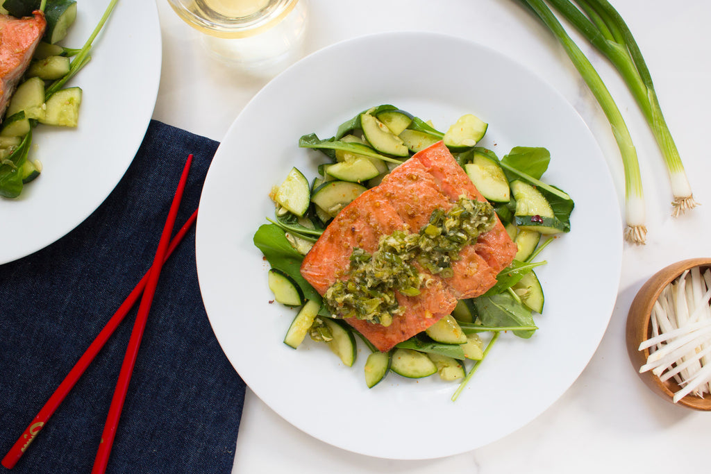 Strain the turnips and divide evenly among 2 plates along with the mizuna and smashed cucumbers. Top with the salmon and ginger scallion sauce. Season with the dulse flakes and salt to taste.
