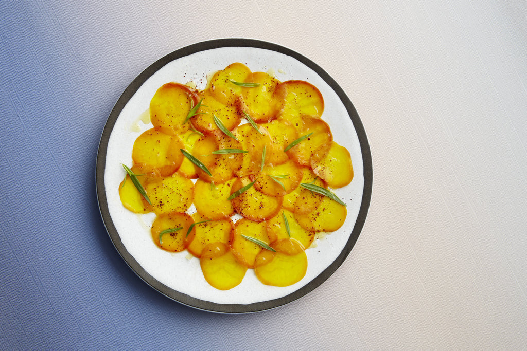 3. Rub the beets gently to remove the skin.* Holding the beet on its side, slice into paper-thin rounds using a very sharp knife or a mandolin. Arrange the beet slices on a large flat platter as you go, overlapping one another on the edges in a fish scale pattern. After one layer is complete, sprinkle 1 tablespoon of tarragon leaves over the beets, then continue to layer the paper-thin rounds on top.
