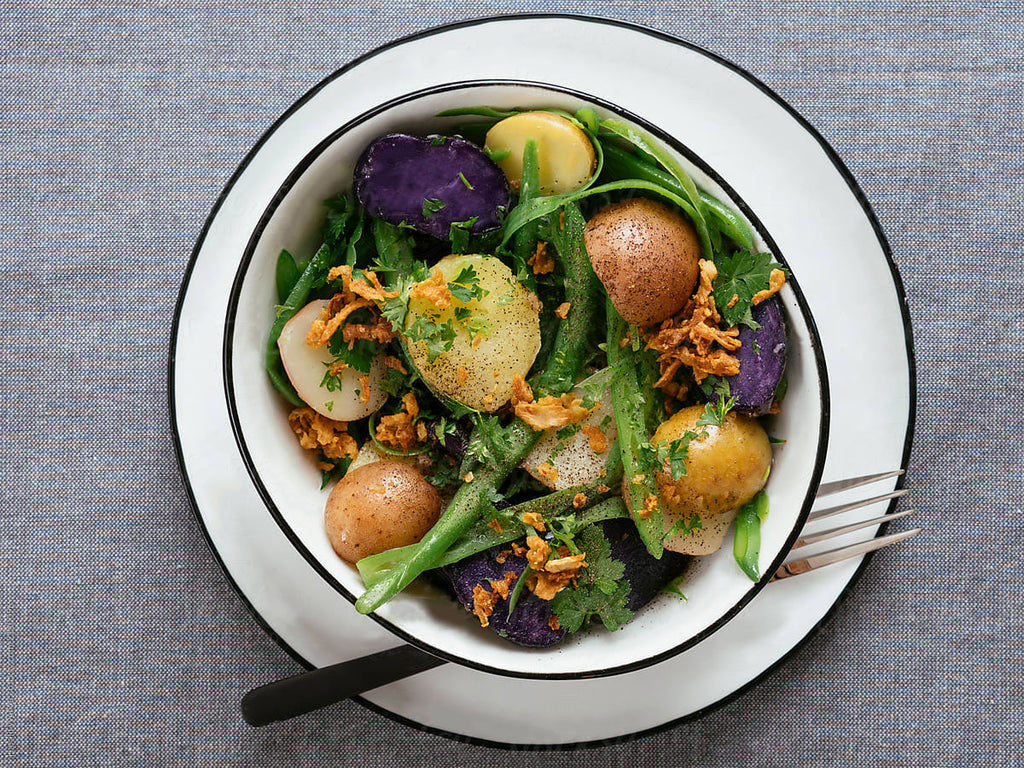 Once potatoes are cool enough to handle, slice smaller ones in half lengthwise and larger ones in quarters. Toss in large bowl with green beans. Add dressing and toss until everything is well coated. Add chopped fresh herbs and scallions, if desired.