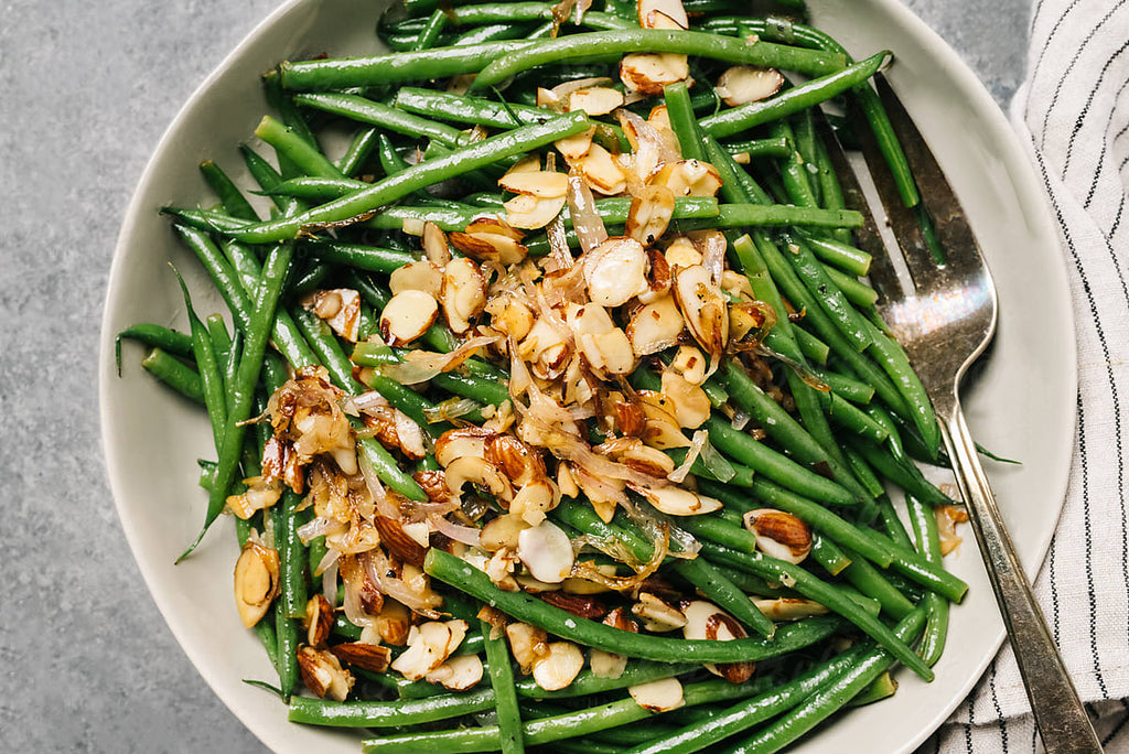 In same pan over medium-high heat, add 1 teaspoon olive oil. Add green beans, season with sea salt and pepper and cook 3 to 4 minutes, stirring occasionally, until heated through and lightly browned. Transfer to platter and top with shallot almond mixture.