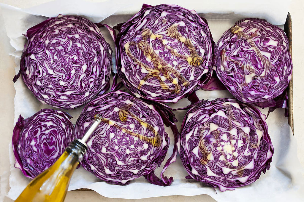 While grill heats, prepare cabbage. Trim bottom of cabbage so it can stand. Be careful not to trim too much as stem is what holds layers together. Slice standing cabbage into ¾ to 1-inch thick pieces. Cover both sides with oil, sea salt and pepper. Place slices directly on grill and cook 5-6 minutes; then, carefully flip and grill another 2-3 minutes, depending on thickness, until tender on the inside, but crispy on the outside.