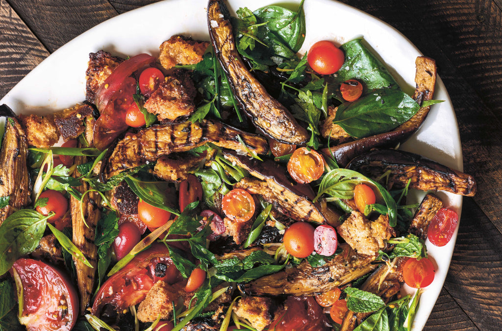 When the eggplants are cooked, pile them into a large bowl. Add the vinegar, 1/2 teaspoon salt, and lots of twists of pepper and toss to distribute all the seasonings. Add the tomatoes, scallions, croutons, and herb leaves and toss gently. Add 1/2 cup olive oil and toss. Taste and adjust the seasoning. Let the dish sit for a few minutes so the tomato juices soak into the croutons and serve at room temperature.
