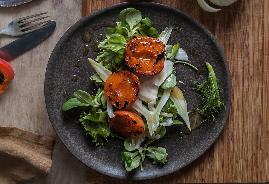 Whisk together lemon juice and olive oil. Season with sea salt and pepper, to taste. Plate lettuce with sliced fennel and fennel fronds. Top with grilled peach halves, toasted nuts, and drizzle with lemon vinaigrette.