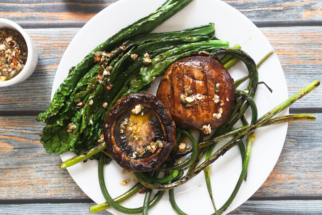 Place mushroom caps over direct heat on the grill or in a pan over medium-high heat. Cook until soft and browned, about 5 minutes per side. Transfer to a platter. Add scapes to the hottest part of the grill or pan and cook for about 2 minute per side. Scapes should char slightly, but retain their bright green color. Add kale and heat until lightly browned and crisp around the edges. Arrange scapes, kale and portobellos on a serving platter and drizzle with almond caper sauce.