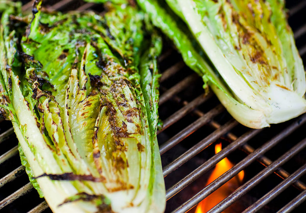 Drizzle olive oil over cut side of Romaine and season with sea salt and pepper. Place hearts on preheated grill, cut side down. Grill 2-3 minutes until grill marks appear and hearts are slightly charred. Flip and grill another 1-2 minutes.