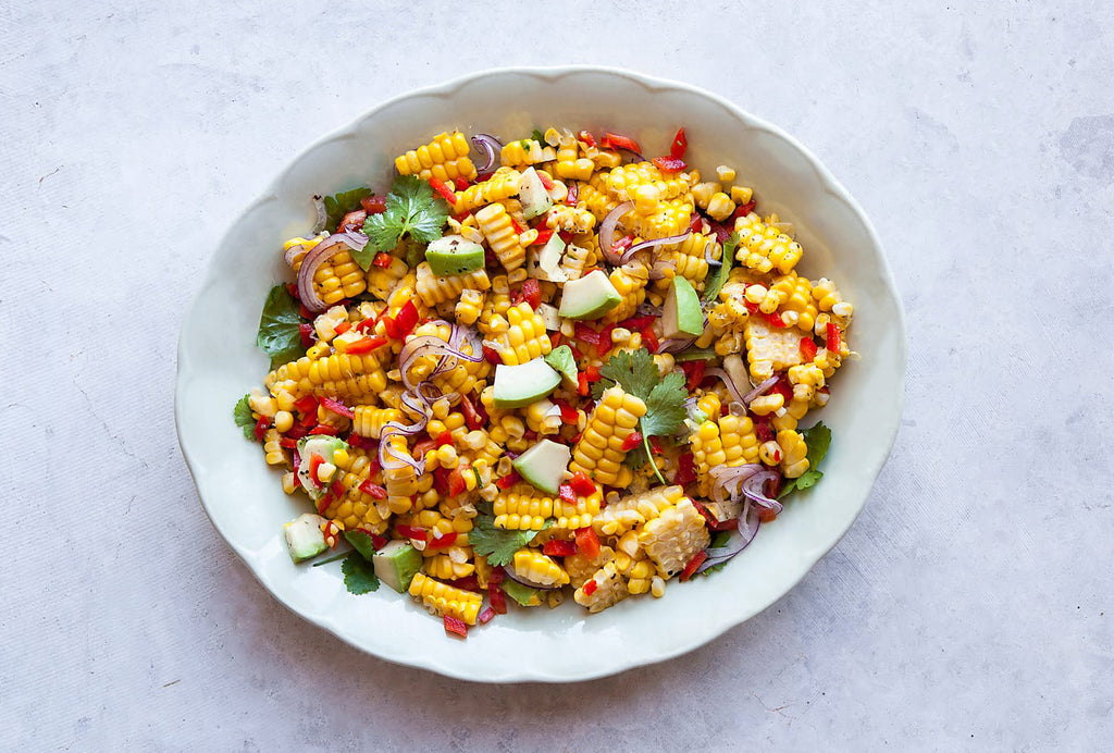 Cut grilled corn kernels off cobs using sharp knife and place in large bowl. Peel charred skin off grilled peppers and dice into small pieces. Add to bowl with corn; then add red onion, avocado, and cilantro to bowl.