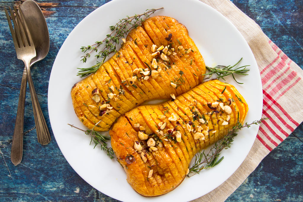 Once squash is golden and tender, remove from oven; spoon some pan juices over squash, sprinkle with remainder of chopped herbs, sea salt, and chopped nuts.