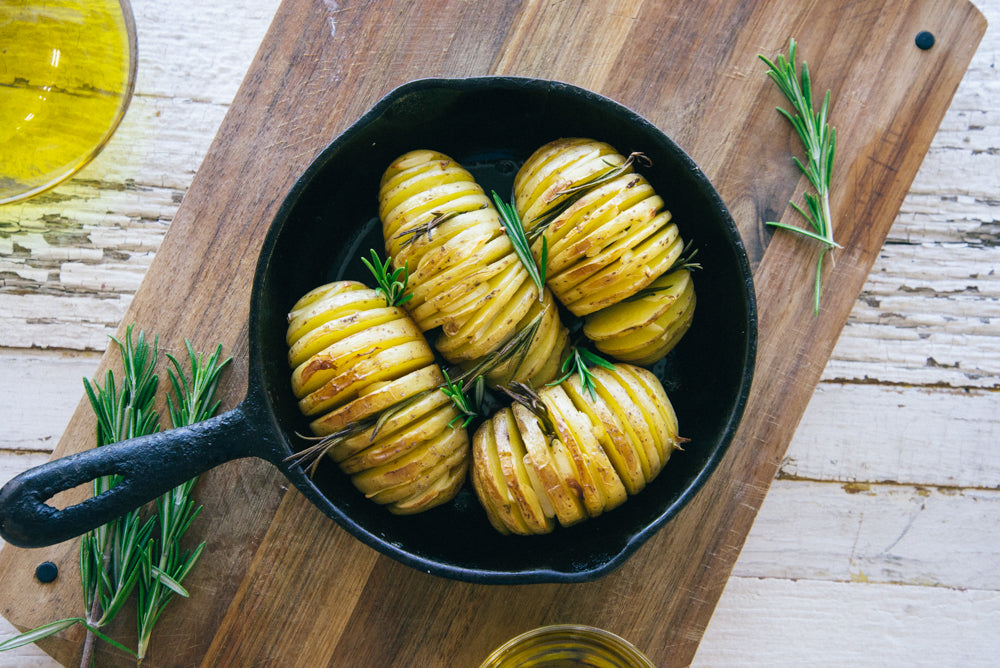 Bake for 30 minutes, then remove from oven and brush again with olive oil. Make sure to get in between the slices. Place garlic slivers and rosemary in the potato slits. Bake for another 30 to 40 minutes, until the potatoes are crispy on the edges and the middles are easily pierced with a paring knife.