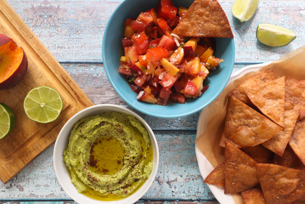 Cut the tortillas into sixths. Heat the oil in a deep pot to 360º. Add the tortilla chips in batches; don’t overcrowd them. Cook until golden brown. Remove from the oil and drain on paper towels. Toss with flaky sea salt and serve warm with the salsa and hummus.
