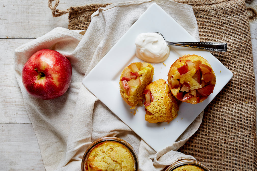 Preheat your oven to 375°. Grease a muffin tin. Toss the apples with the honey and put a single layer of apples in the bottom of each muffin well. Combine the cornmeal, flour, sugar, baking powder and salt in a large bowl. In a small bowl whisk together the milk, yogurt and the eggs. Pour the milk and egg mixture into the bowl with the dry ingredients. Add the melted butter. Use a spatula to mix everything together. The batter should be wet enough to pour, but still thick like gruel. Add an additional ¼ cup of milk if you need to. Pour the batter into the muffin tin, covering the apples and dividing the batter evenly. Bake for 20-25 minutes until the tops have begun to brown around the edges and the center has just set. When you touch it, it shouldn’t jiggle. Be careful not to over-bake.