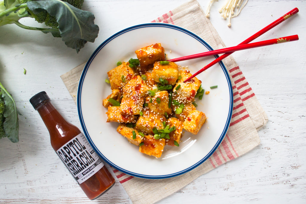 Heat oil in a large pan. When oil is hot but not smoking, add tofu cubes and fry on all sides without disturbing, for about 4 minutes. Add sauce and carefully stir to coat. Cook for a couple more minutes and then serve and sprinkle with sesame seeds if you have on hand.