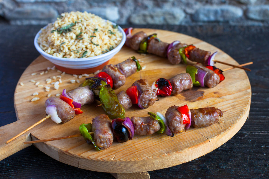 If using wooden skewers, soak in water for 15-30 minutes before cooking. Preheat your broiler, or a grill, on high heat. Place the oven rack about 8" from the broiler element. Cut the sausages, peppers and red onion into 1" pieces. Assemble on the skewers, alternating the ingredients and dividing equally between the four. Place the assembled skewers on a sheet tray and drizzle with olive oil. Season lightly with salt and pepper. Place underneath the broiler. Cook for 3-4 minutes, then flip and cook for another 3-4 minutes or until the juices from the sausage run clear. Great served alongside a simple cucumber farro salad.