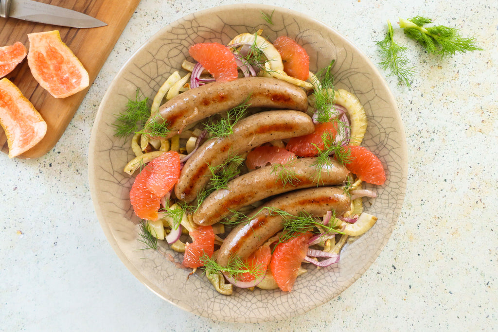 When fennel is done, transfer to a serving platter. Place sausages on top and scatter with grapefruit segments and fennel fronds; and serve.