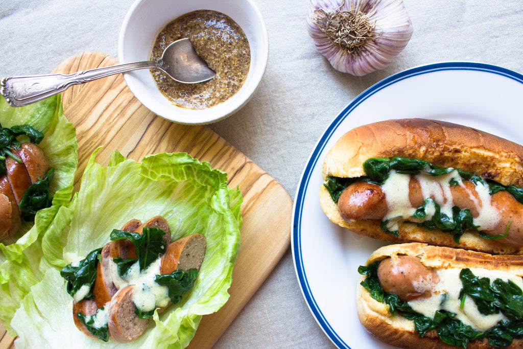 If you would rather have a lettuce wrap, wait until the sausages are completely cooled, then slice the sausages diagonally. Have each eater build their wrap with grated cheese, sausage, and spinach.