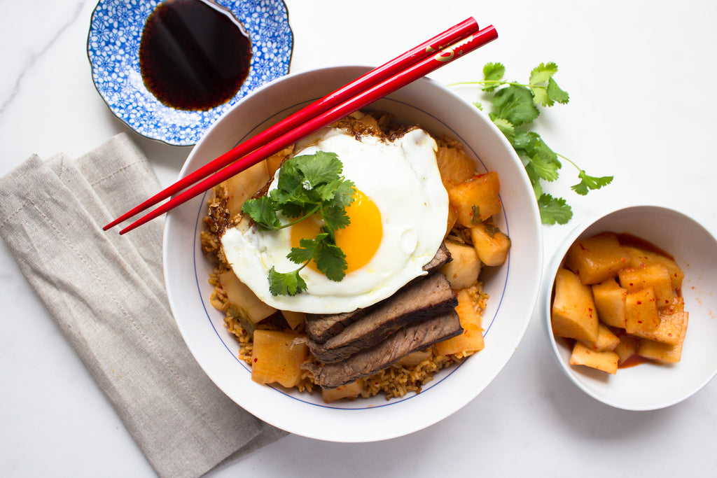 Ingredients:Bring 2 cups of water to a boil, then add rinsed rice. Reduce to a simmer, cover, and allow to cook until the liquid is completely gone, about 15-20 min. Put rice aside, and spread in a pan or on a plate to dry for 10 minutes. While the rice is cooking roughly chop ½ cup of kimchi.