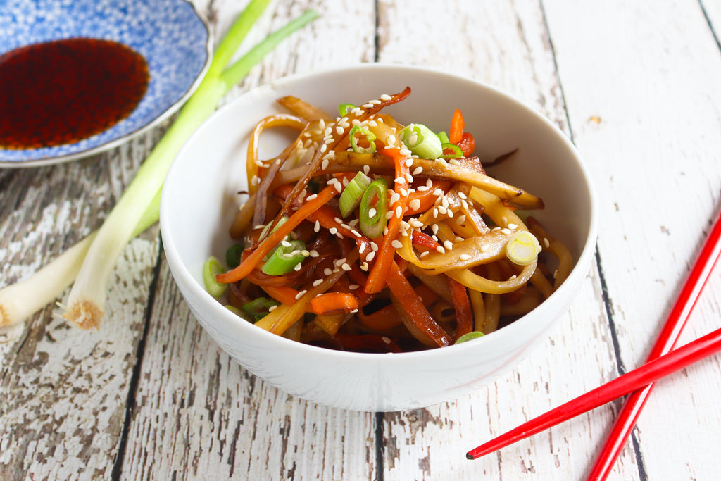 Peel the burdock root, cut into matchsticks and soak in water. Rinse until water runs clear. Cut carrots into matchsticks as well.