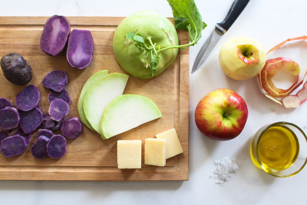 Preheat oven to 350. Peel the potato, apple and kohlrabi. Slice one quarter inch thick using a mandolin, if possible. Grease a baking dish with butter; then grate the Everton cheese. Season the sliced vegetables with salt and extra virgin olive oil. Layer the vegetables in the greased baking dish, alternating in threes with cheese sprinkled generously in between each layer. Use any remaining cheese to coat the top of the gratin. Bake until the vegetables are tender (approximately 45 minutes).