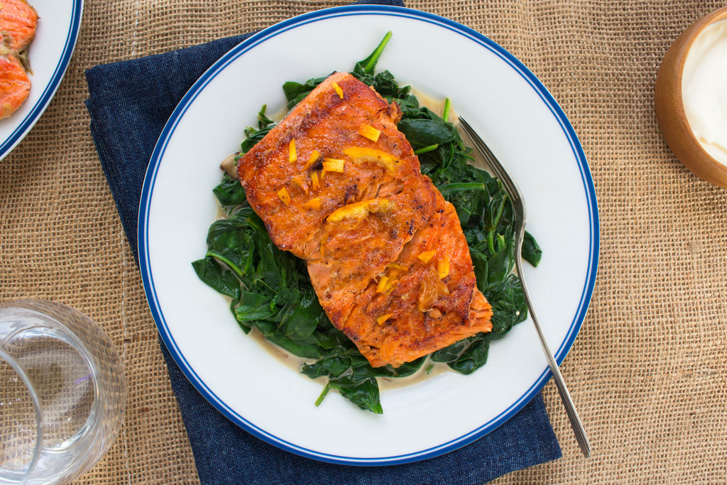 Meanwhile, in a separate sauté pan over a medium flame, heat the remaining oil. Add the spinach along with a pinch of salt and stir until wilted and tender, about 6-8 minutes. If necessary, add a few drops of water. Divide the spinach between 2 plates. Remove the salmon from the oven and carefully cut in half. Place atop the spinach and cover with the kumquat and carrot sauce. Season with salt and pepper to taste.