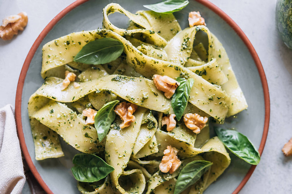 Drain pappardelle, reserving ½ cup pasta water. Toss pappardelle with pesto, 1 tablespoon at a time, until well coated. Slowly add a bit of pasta water to loosen up sauce, if desired.