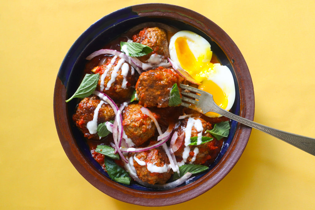 Return the meatballs and their juices to the pot and stir gently to coat them in the sauce. Keep at a gentle simmer, cover and cook for about 30 minutes to let the flavors come together. Season sauce with salt and pepper to taste. Crack 3 eggs into the pan and cover again until egg whites have set. Remove from heat and divided among shallow bowls and drizzle with yogurt and olive oil. Sprinkle torn mint leaves and sliced red onion and serve.