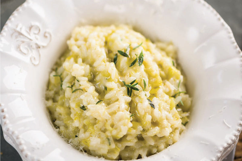 Heat 2 tablespoons oil in deep, heavy sauté pan over medium heat. Add shallot and cook 2 to 3 minutes, until translucent, then leeks and cook an additional 3 to 5 minutes until leeks soften. Stir in rice and toast 2 to 3 minutes.