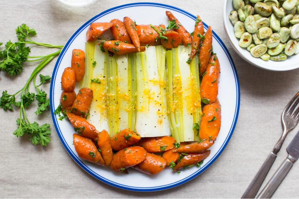 Halve leeks and arrange on serving platter with carrots. Drizzle with citrus vinaigrette. Store extra vinaigrette in fridge up to a week.