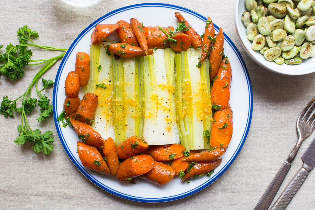 Halve the leeks and arrange on a serving platter. Drizzle the leeks and the fava beans with the kumquat dressing.