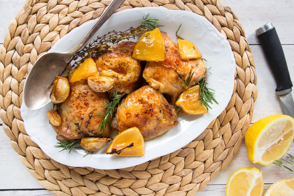 Rinse chicken thighs and pat dry. Place them in a roasting pan and sprinkle with salt and pepper. Add garlic cloves, lemon chunks, thyme, rosemary and olive oil. Toss everything together and spread out in the baking pan. Make sure skin side of chicken is up and pour the white wine in pan. Cover tightly with foil and cook in the oven for 1 hour.
