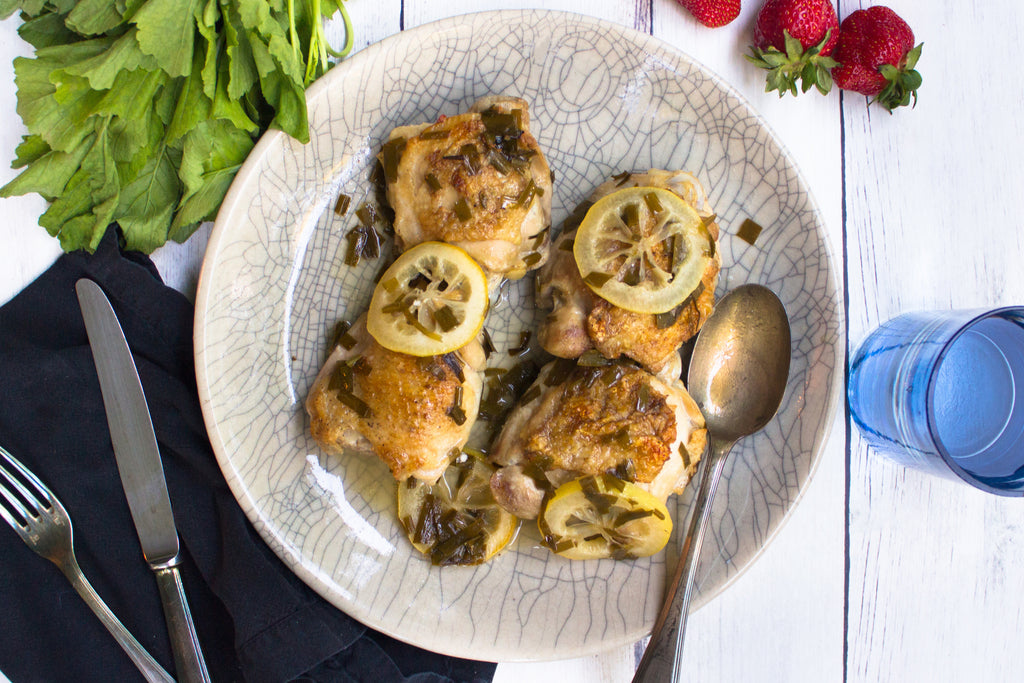 Deglaze the pan with the white wine and let simmer for two minutes. Add lemon and chicken stock and cook for about 5 minutes until liquid has reduced to half. Place chicken back in the pan, skin side up, and spoon sauce over it. Place pan in the oven and roast until completely cooked through, reaching an internal temperature of 165 degrees, about 20-25 minutes. Check if chicken is done by slicing through the center. If juices run clear, chicken is done.