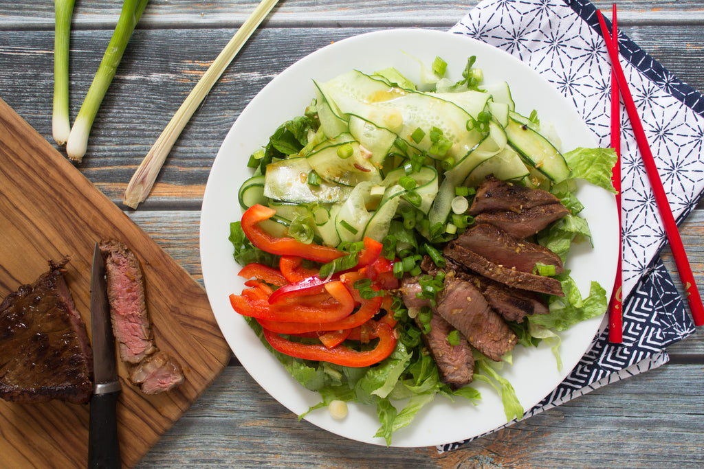 Divide the salad mix between two plates and top with cucumber, bell pepper, steak strips and scallion. Pour dressing over salad and serve.