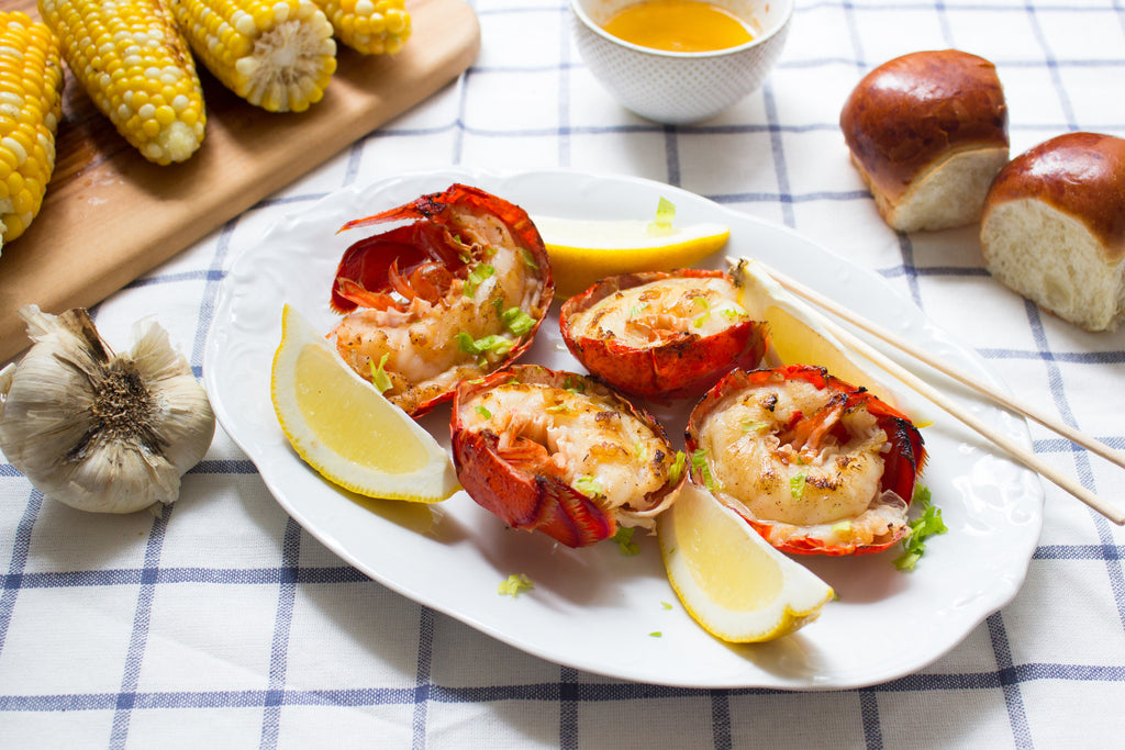 Divide the lobster tails and corn among 2 plates. Serve with the dinner rolls and any remaining garlic butter.