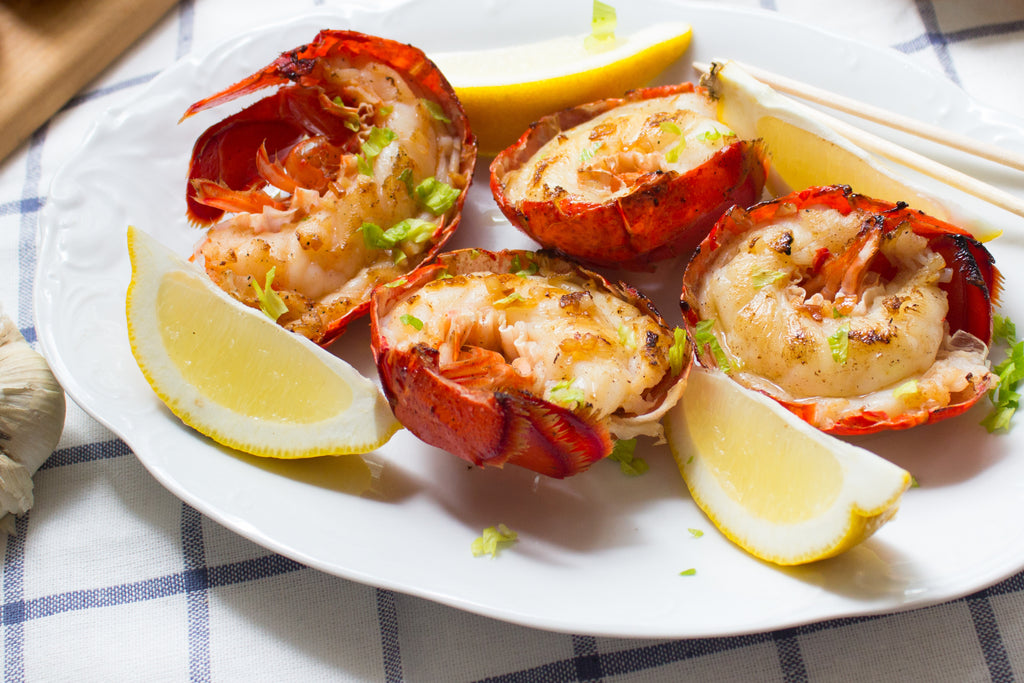 Prepare the lobster tails by patting them dry and laying them flat on a cutting board. Using a sharp knife and starting from the flippers, cut each in half lengthwise. Pat the exposed meat dry.