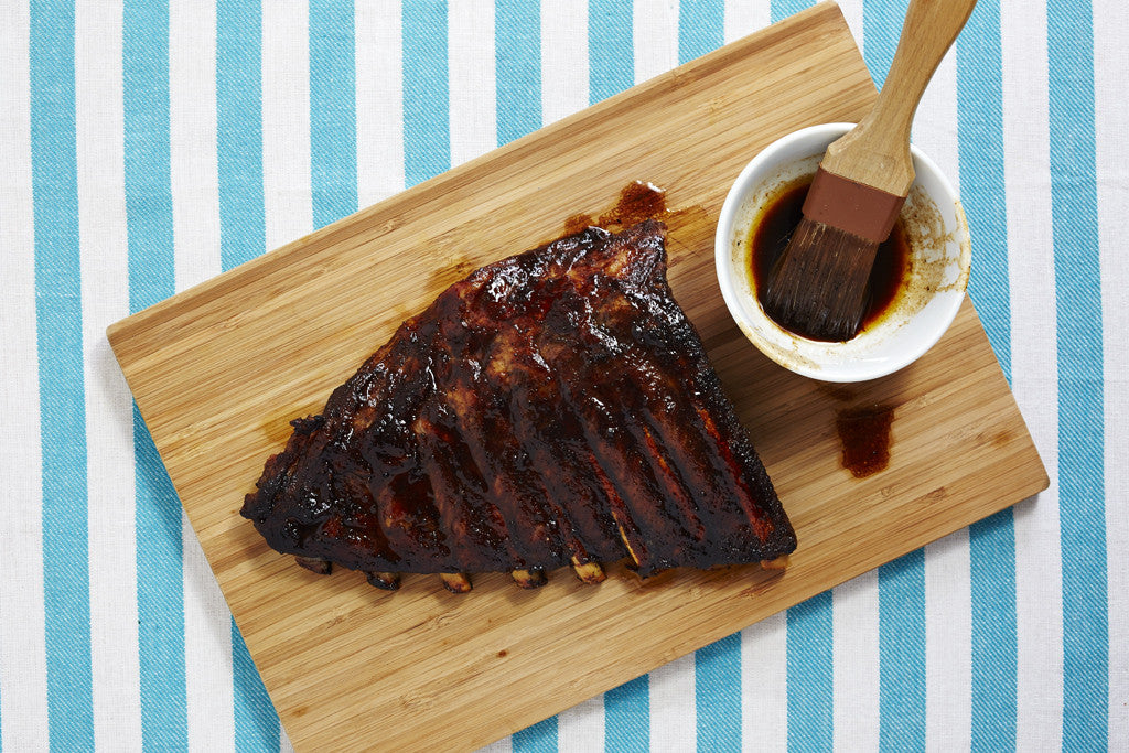 Mix together chile powder, paprika, sea salt, and pepper. Put ribs on big piece of foil and rub spice mixture all over them. Wrap ribs in foil (make sure seam of foil packet is on top). Cook in oven 3 hours. Remove ribs and unwrap carefully over skillet – they will have released some juices. Meat should have pulled back from bone about ¼-½ inch. Put ribs on baking sheet and turn oven to 425 degrees. Pour juices from ribs into skillet. Add maple syrup and heat over low flame. Whisk glaze until juices reduce and thicken. Brush glaze on both sides of ribs and return them to oven. Cook 5-10 minutes; then glaze again. Continue cooking and glazing 20-30 minutes, until ribs have a nice dark brown, caramelized exterior. When you think they are done, cut off one rib and try it. If you want the outside crispier or more sugary, glaze again and cook a few minutes more.