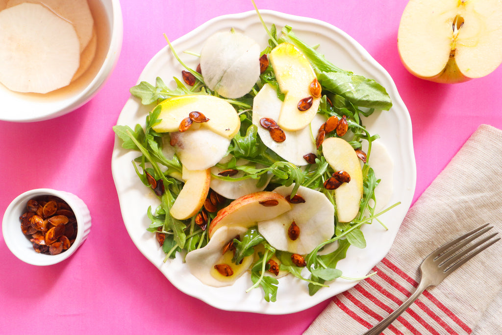 Using a mandoline or sharp chef’s knife, slice the turnip and apple very thinly.