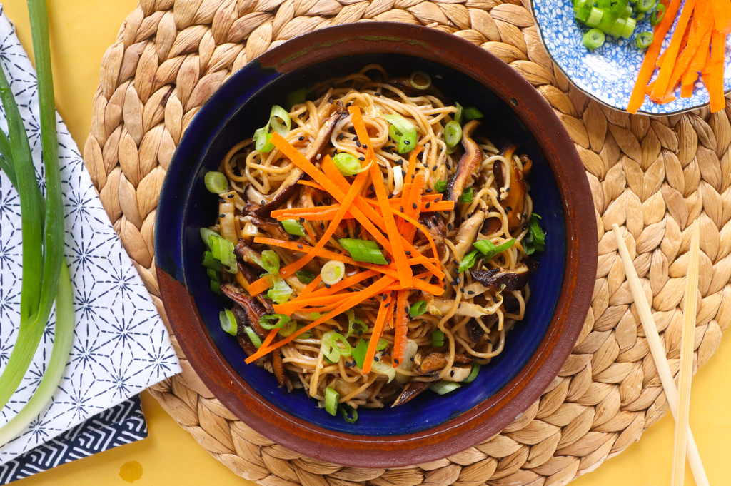 Place your noodles in the boiling water and cook for 30 seconds; then strain. Add noodles to the carrots and shiitakes along with the rest of the sesame oil, soy sauce and rice wine vinegar. Toss until well combined. Adjust seasoning to taste. Divide between two bowls and garnish with more sliced scallion and sesame seeds, if desired.