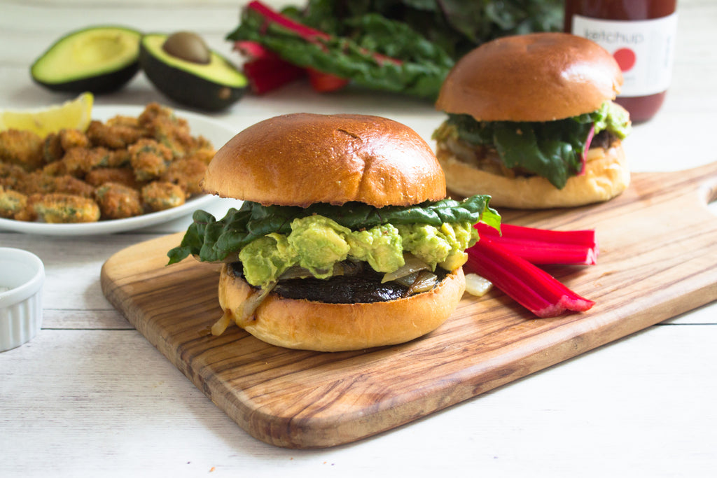 In a small bowl mash the avocado with 1 Tbsp. olive oil, lemon juice, cumin, and salt and pepper to taste. Toast the buns for a few minutes. Assemble the burgers with mushroom caps, caramelized onions, avocado, a chard leaf and your favorite burger accompaniments. Serve with lots of napkins!