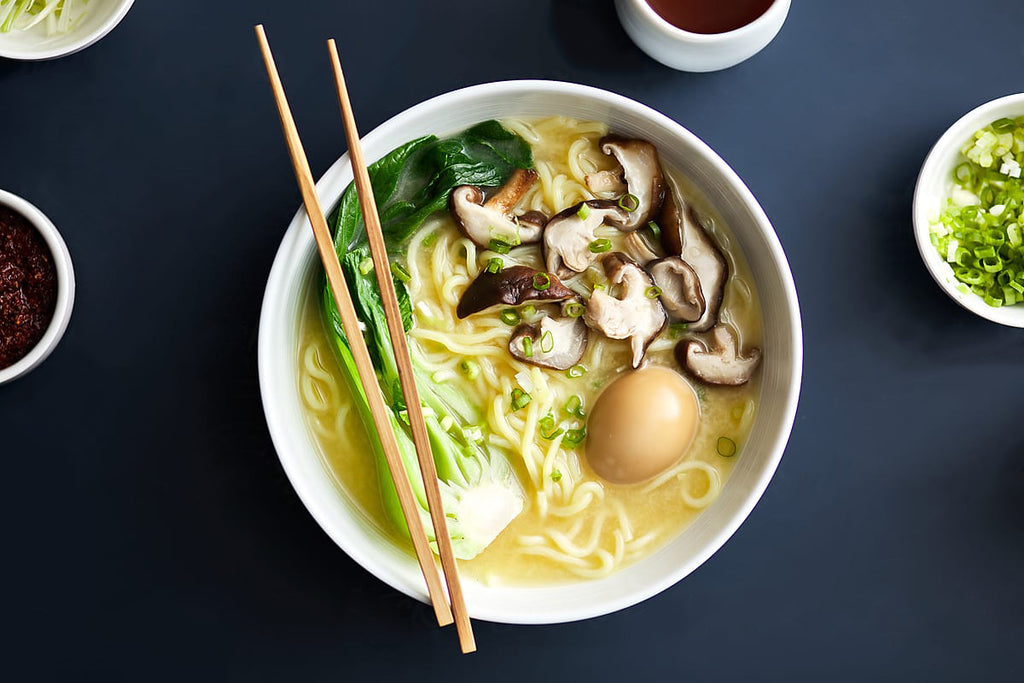 When broth has simmered for 30 minutes, turn off heat, stir in soy sauce and miso. Pour broth over noodles and stir in kimchi liquid, if using. Top with bok choy, soft boiled eggs, scallions and serve.