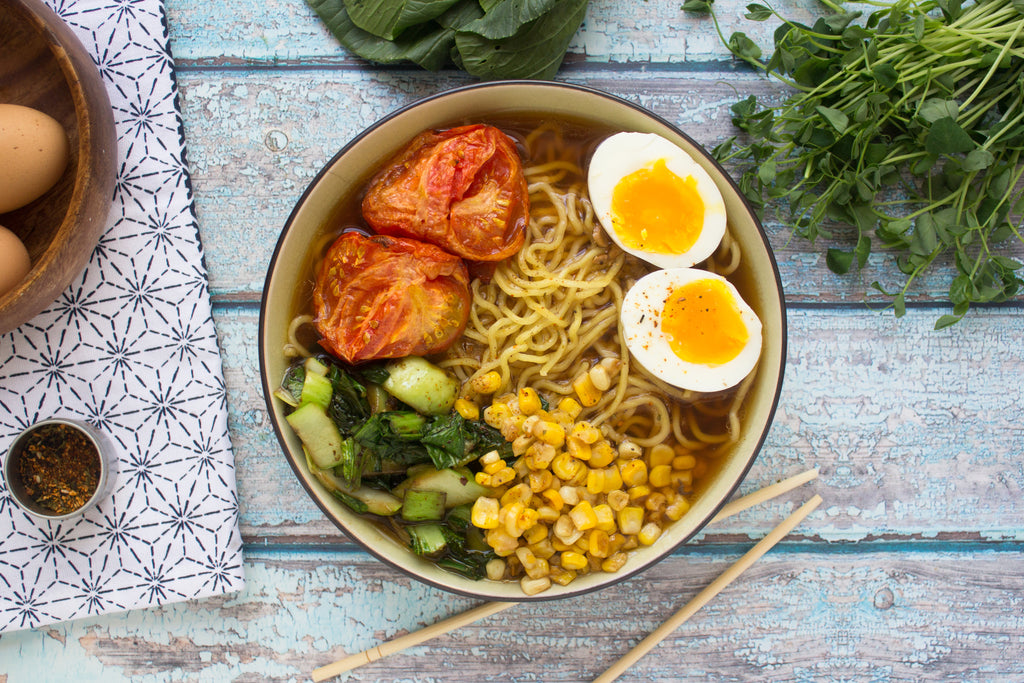 Place noodles in boiling water for 30 seconds, then drain and divide between two bowls. Pour broth over noodles and top with roasted tomato, tatsoi and corn. Slice eggs in half and place on top.