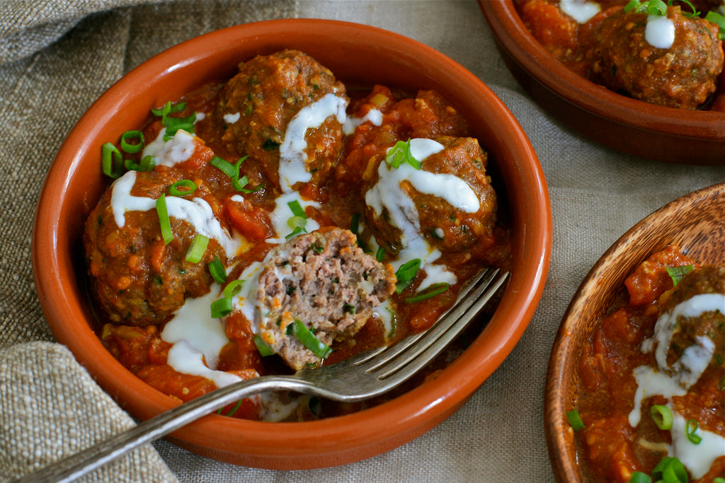 Once the meatballs are done, remove from the oven. Add them, plus any pan juices, to the sauce. Stir well to combine and continue to simmer another 8-10 minutes. Serve topped with minced chives, a drizzle of yogurt and crusty bread.
