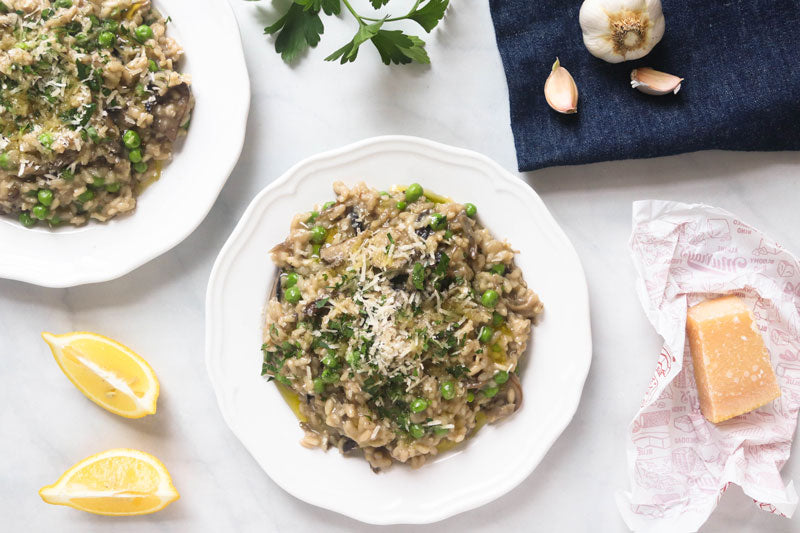 Melt butter in a large pot or Dutch oven over medium heat. Add olive oil and onions and sauté 8 minutes, until tender. Add mushrooms and garlic. Season with sea salt. Continue to sauté 5 minutes until mushrooms are tender and juices evaporate. Stir in rice and cook for 2 minutes until grains are well-coated and smell slightly toasty. Add wine and cook until liquid is absorbed, stirring often. Add 1 cup hot broth; simmer over medium-low heat 3 minutes until liquid is absorbed, stirring often. Add remaining broth, 1 cup at a time, continuing to allow rice to absorb each addition of broth before adding more. Stir often and cook until risotto is al dente and creamy, not mushy. Stir in peas and parmesan. Season with sea salt and pepper, to taste, and serve with more grated parmesan and a sprinkle of minced herbs, if desired.